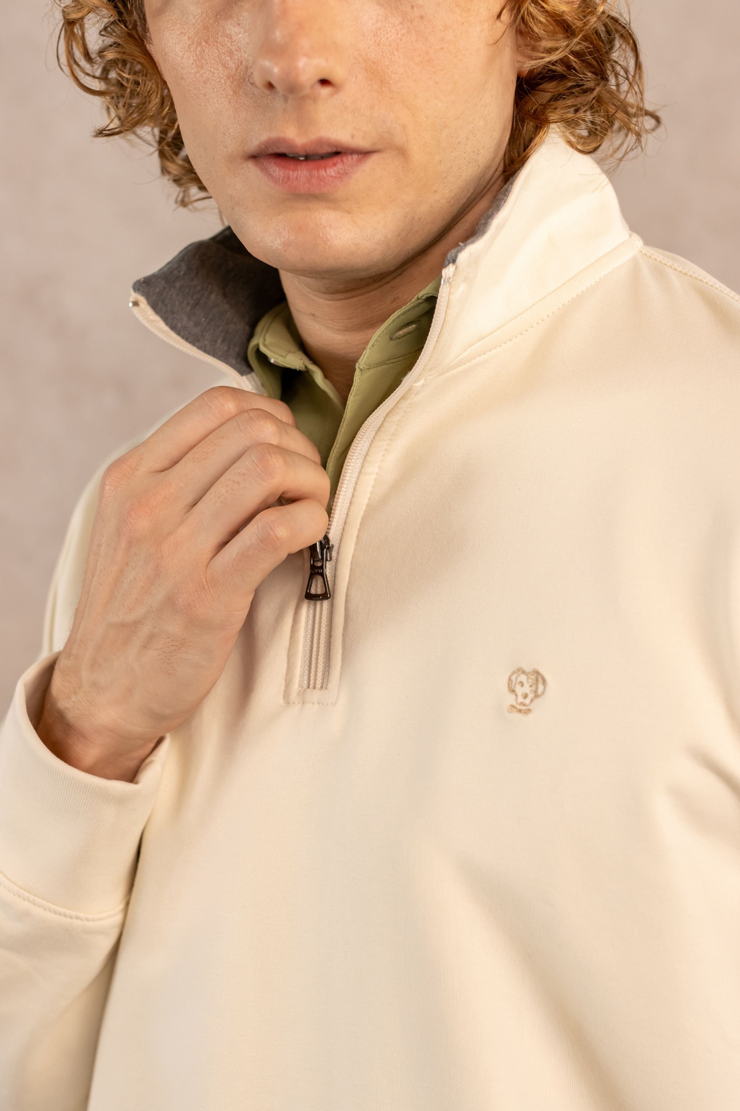 El diseño minimalista con cierre half-zip no solo aporta estilo, sino que te permite ajustar el cuello con total comodidad.